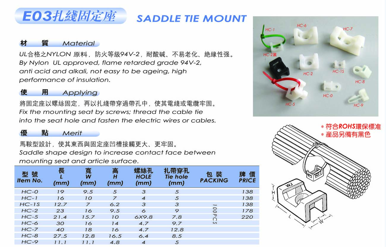 使用:将固定座以螺丝固定,再以扎线带穿过带孔中,使其电线或电缆牢固。