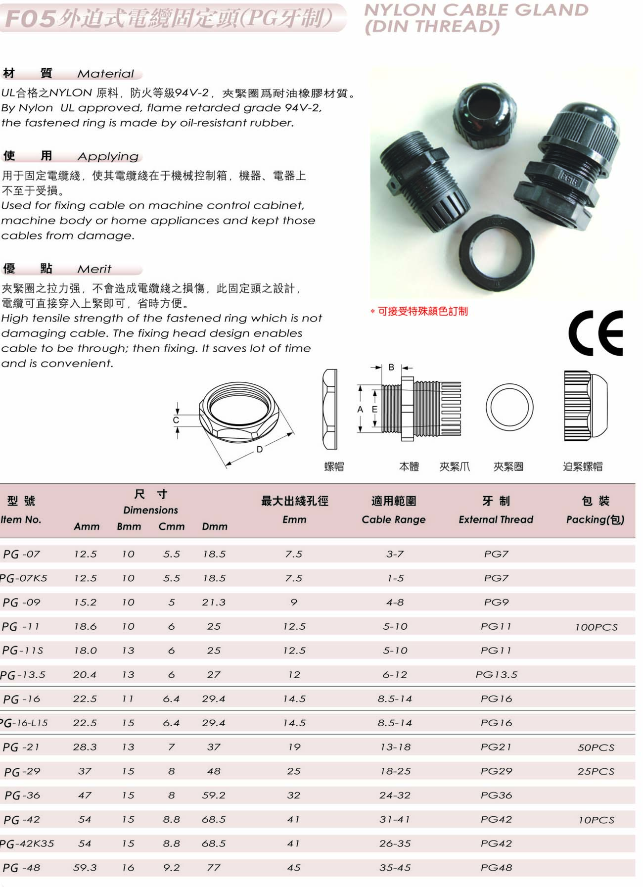 材质:UL合格之NYLON原料,防火等级94V-2,夹紧圈为耐油橡胶材质,