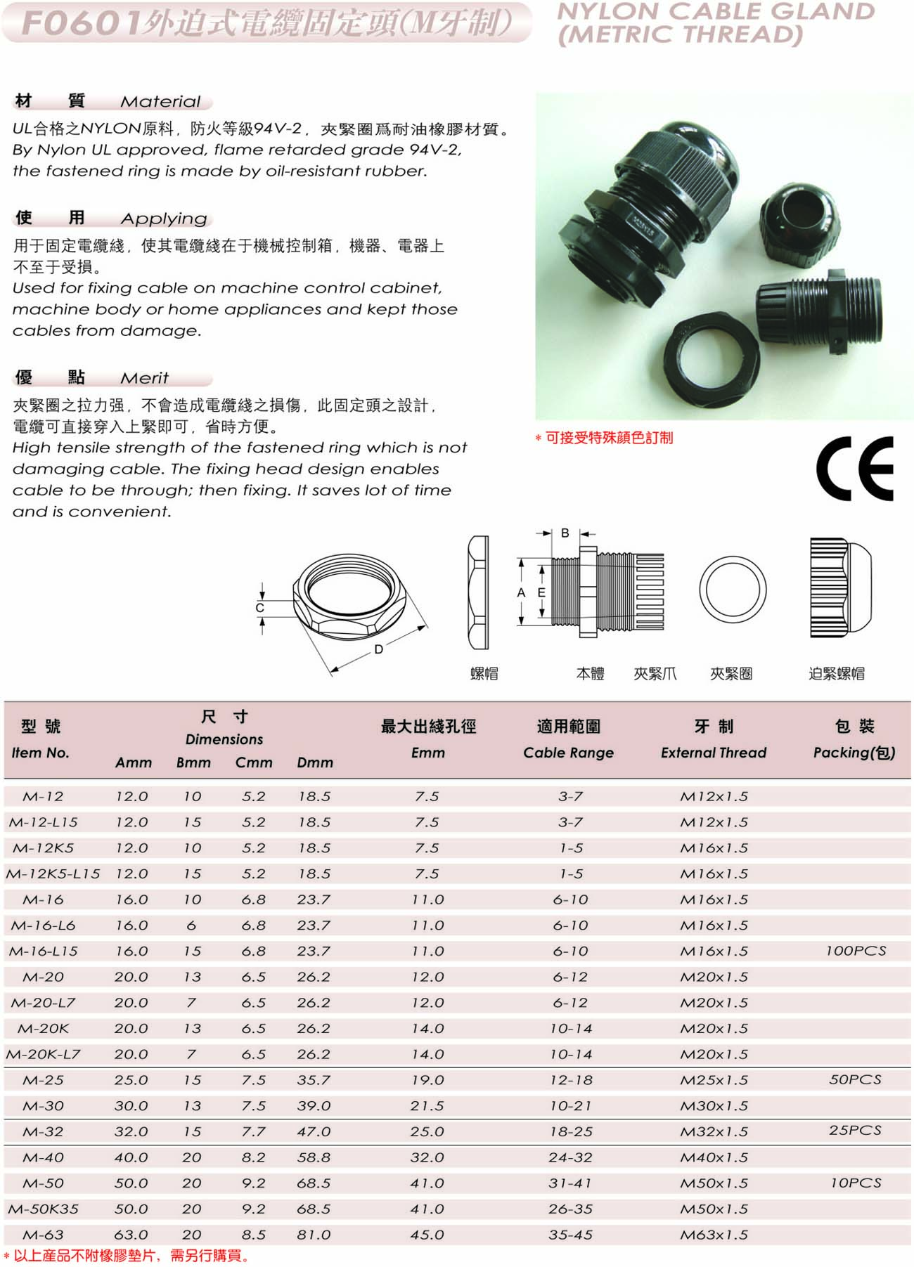 材质:UL合格之NYLON原料,防火等级94V-2,夹紧圈为耐油橡胶材质。